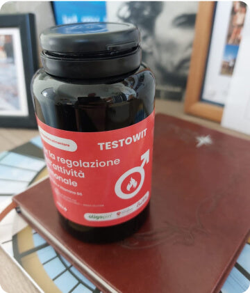 TESTOWITcontiene Muira Puama (Ptychopetalum olacoides Benth.) estratto di corteccia (D/E: 4/1), RedNite™ (succo di radice di Barbabietola rossa in polvere titolato all’1,5% in nitrati), Maca (Lepidium meyenii Walp.) estratto di radice titolato allo 0,5% in beta-ecdysterone, Fieno Greco (Trigonella foenum-graecum L.) estratto di semi titolato al 50% in protodioscina, gluconato di zinco, KSM-66® Ashwagandha (Withania somnifera) estratto di radice titolato al 5% in withanolidi, Oligopin® (estratto di corteccia di Pino Marittimo Francese titolato al 65% in procianidine oligomeriche), Estratto di semi d’Uva Rossa titolato al 95% in proantocianidine, acido borico, gluconato di rame, cloridrato di piridossina (Vitamina B6), colecalciferolo (Vitamina D3), D-alfa-tocoferil acetato (Vitamina E) e piperina da Pepe Nero (Piper nigrum L.).
