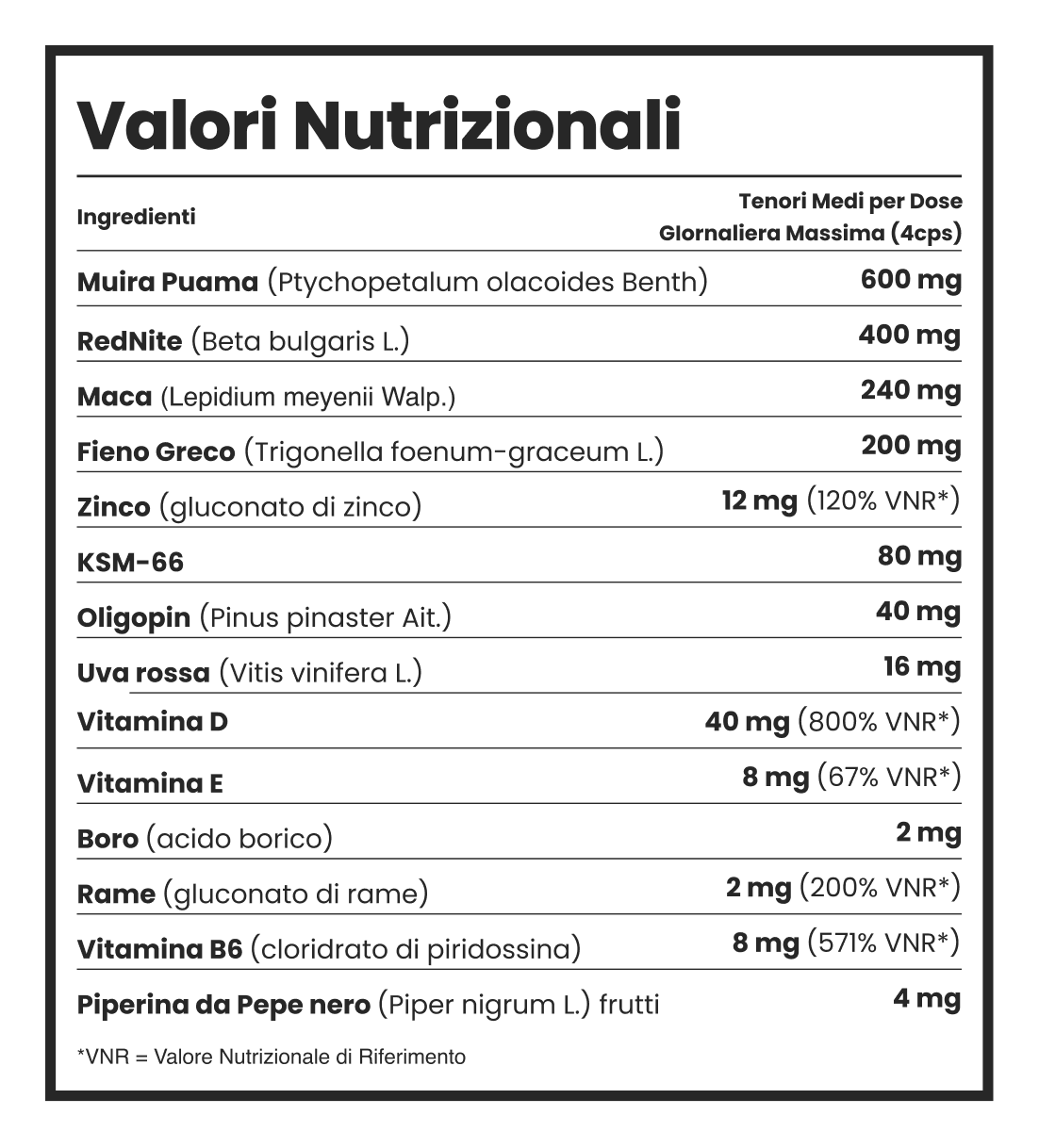 Muira puama (Ptychopetalum olacoides Benth.) corteccia e.s. (D/E: 4/1); RedNite™ [Barbabietola Rossa (Beta vulgaris L.) radice succo polvere tit. all’1,5% in nitrati]; Maca (Lepidium meyenii Walp.) radice e.s. tit. allo 0,5% in beta-ecdysterone; Fieno Greco (Trigonella foenum-graecum L.) semi e.s. tit. al 50% in protodioscina; gluconato di zinco; KSM-66® [Ashwagandha (Withania somnifera (L.) Dunal.) radice e.s. tit. al 5% in withanolidi]; agente di carica: cellulosa; Oligopin® [Pino Marittimo Francese (Pinus pinaster Ait.) corteccia e.s. tit. al 65% in procianidine oligomeriche (OPCs)]; agente antiagglomerante: sali di magnesio degli acidi grassi; Uva rossa (Vitis vinifera L.) semi e.s. tit. al 95% in proantocianidine; colecalciferolo; acetato di D-alfa-tocoferile; acido borico; gluconato di rame; cloridrato di piridossina; Piperina da Pepe nero (Piper nigrum L.) frutti.